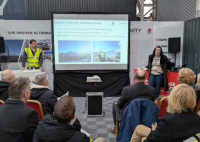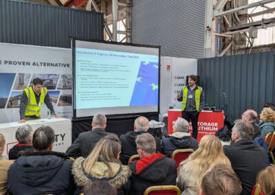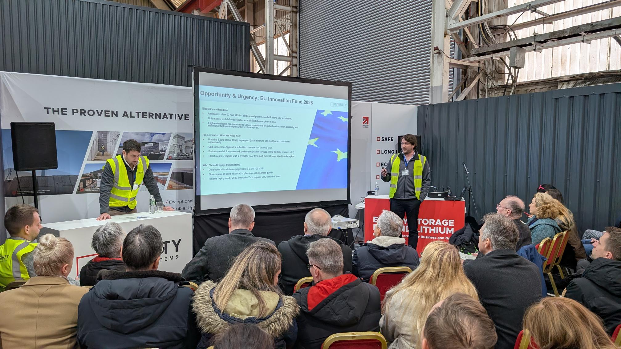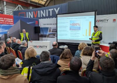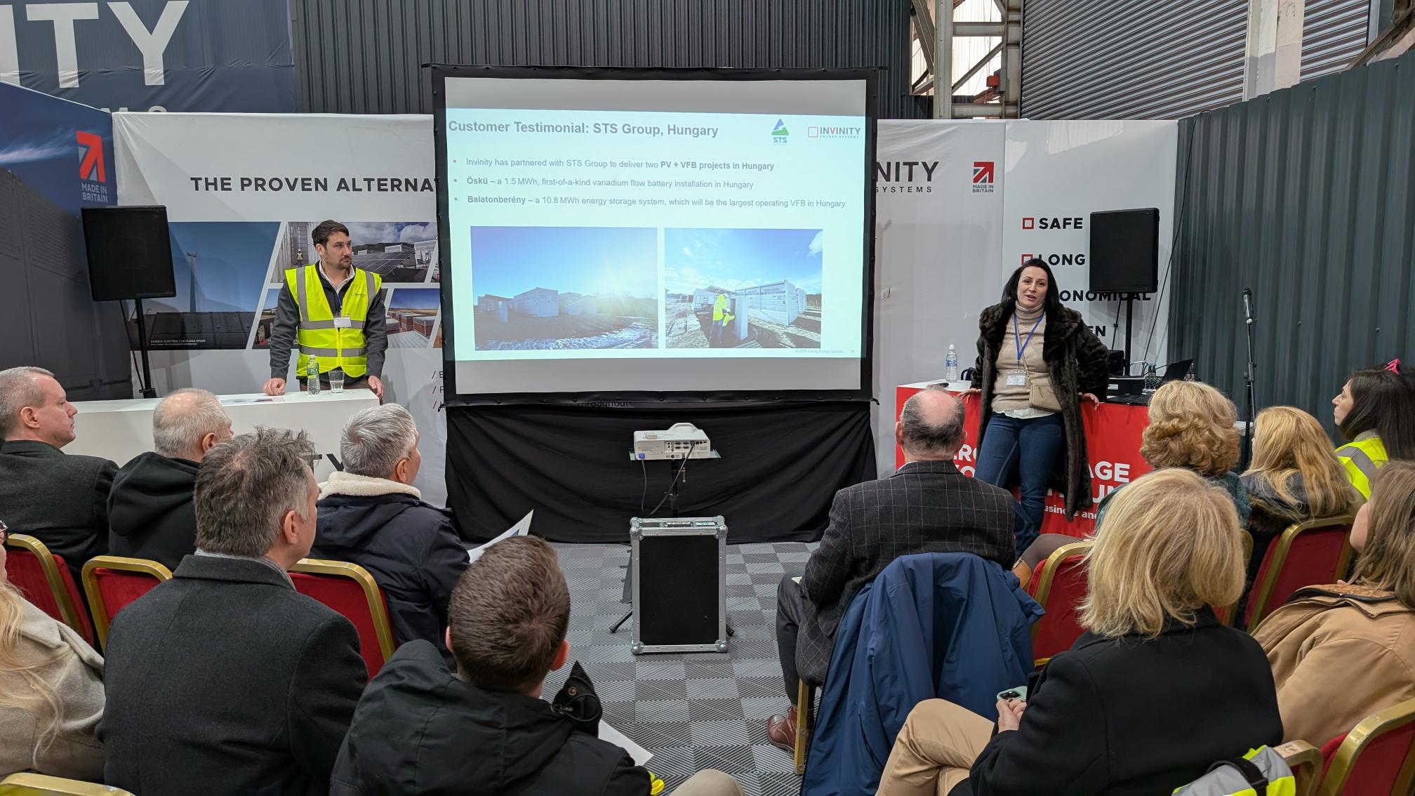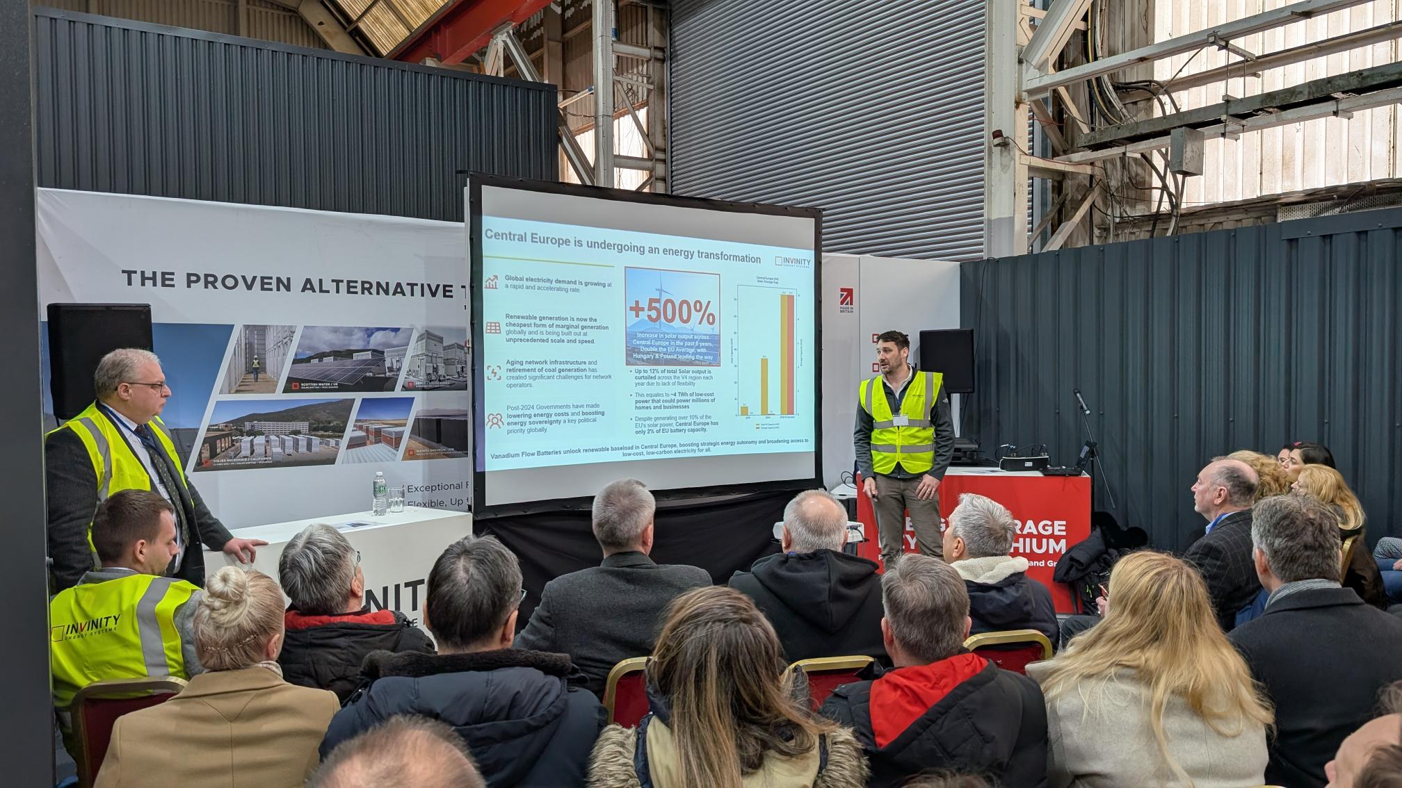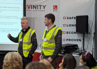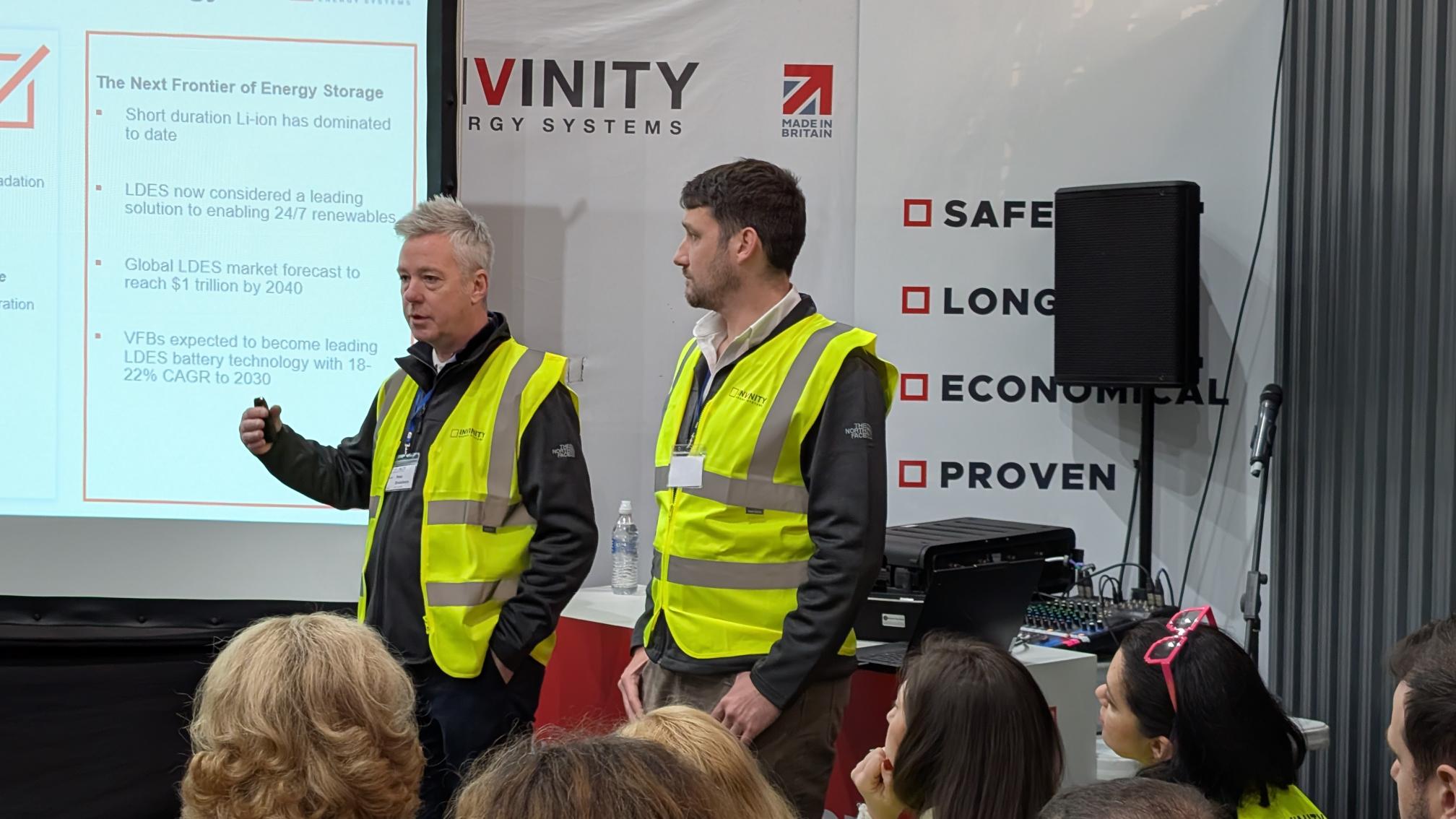 Above: Invinity’s VP of Manufacturing, Paul Docherty (right) addressing delegates on the manufacturing processes and key benefits of Invinity’s vanadium flow batteries